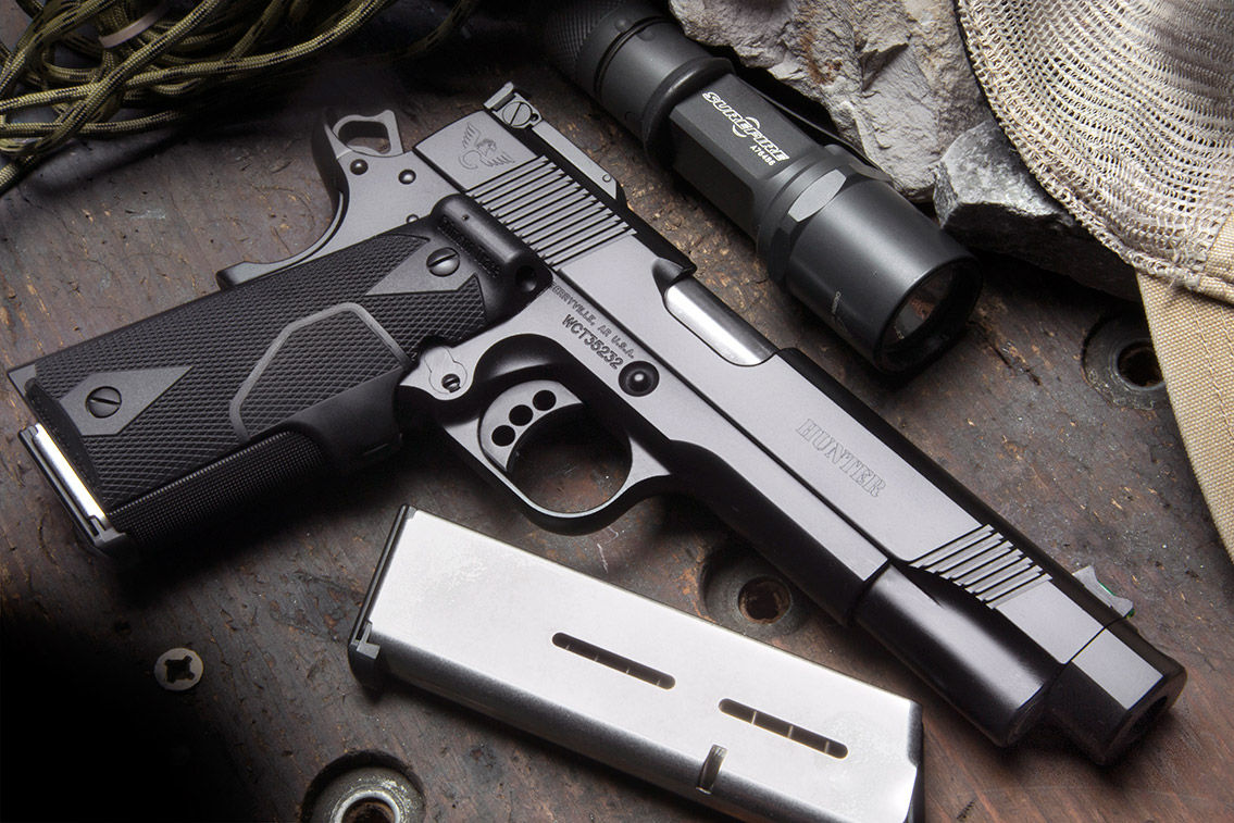 The Hunter purpose built custom 1911 hunting handgun combines the recoil taming effects of integral single port compensator and Crimson Trace laser grips for the ultimate in low-light performance.