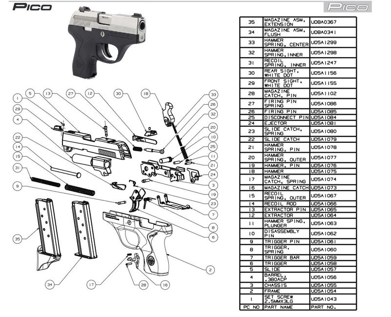 Soft-recoiling and Absolutely ReliableSoft-recoilingThe Pico is soft-recoiling and makes target recovery lightning-quick after every shot, thanks to its minimal barrel tilt. This feature also makes feeding utterly reliable, even with more open hollowpoint designs or the hotter .380 commercial loads.Easy to Disassemble and Customize, Loaded with Features, Made in USALike its slightly bigger brother the Nano, the Pico is engineered to be easy and intuitive to take apart and reassemble. Its heart is a serialized modular chassis, meaning that the frame can be easily swapped to accommodate the user's preferences. Shipped with a storage case and two 6+1 stainless steel magazines (one flush, one with grip extension), the Pico features adjustable, quick-change sights with no gunsmithing required. It also offers ambidextrous magazine release, as well as a super-low-profile slide-release lever to keep the slide open when desired. The Pico is made in USA and brings all the reliability and quality of Beretta as the leader of a new generation of concealed-carry firearms.