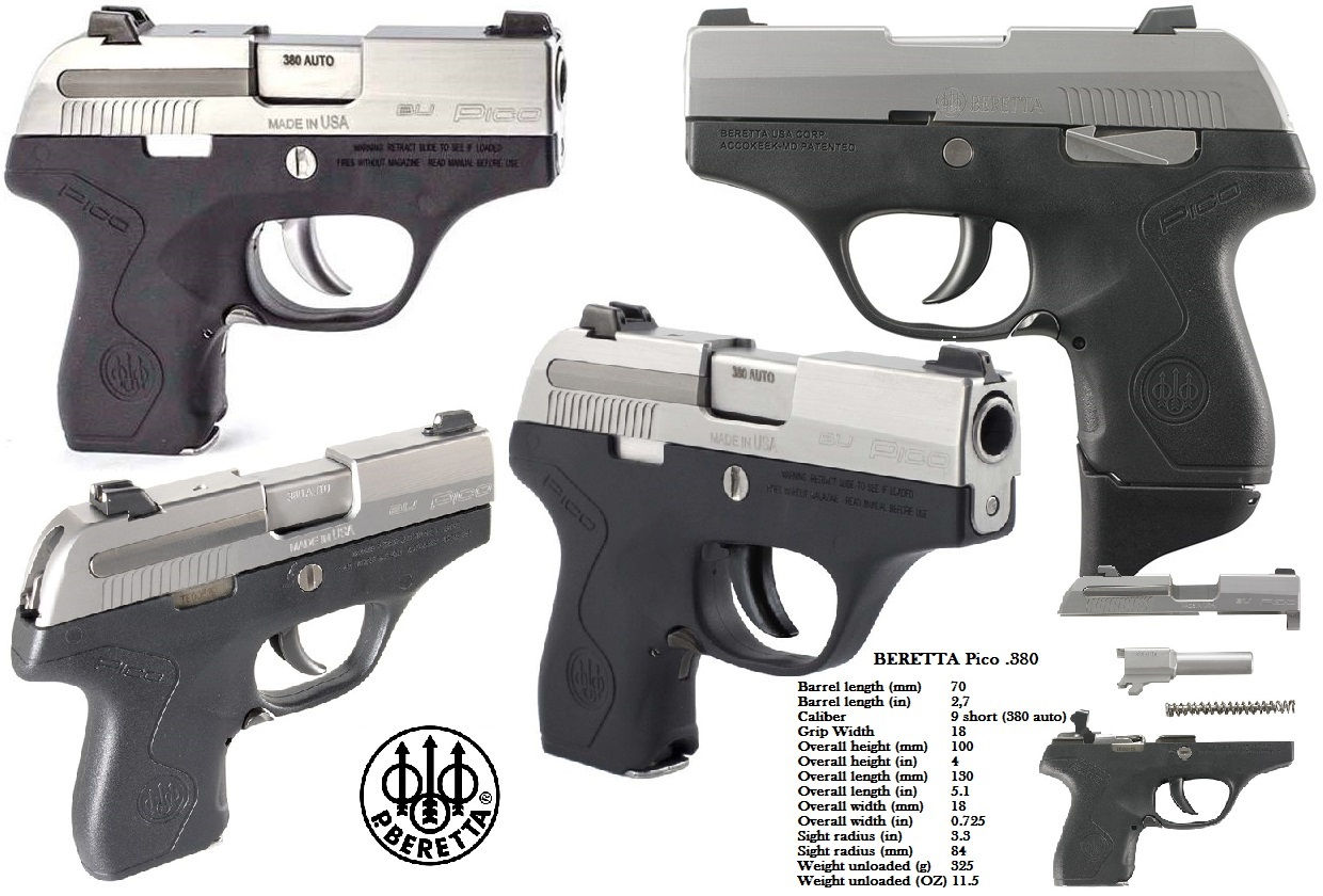 Specifications:The Beretta Pico measures 5.1 inches in length, 4 inches in height, and 0.725 inches wide; barrel length is 2.7 inches and the pistol weighs 11.5 ounces unloaded. The Pico is a Double Action Only (DAO) pistol. Its frame is made of polymer which minimizes weight and provides a comfortable grip. The slide is made mostly from stainless steel. The Pico is also designed to be "snag-free" ensuring smooth and fast extraction from a holster. The Pico's magazine holds 6 rounds; one additional round can be held in the chamber.
